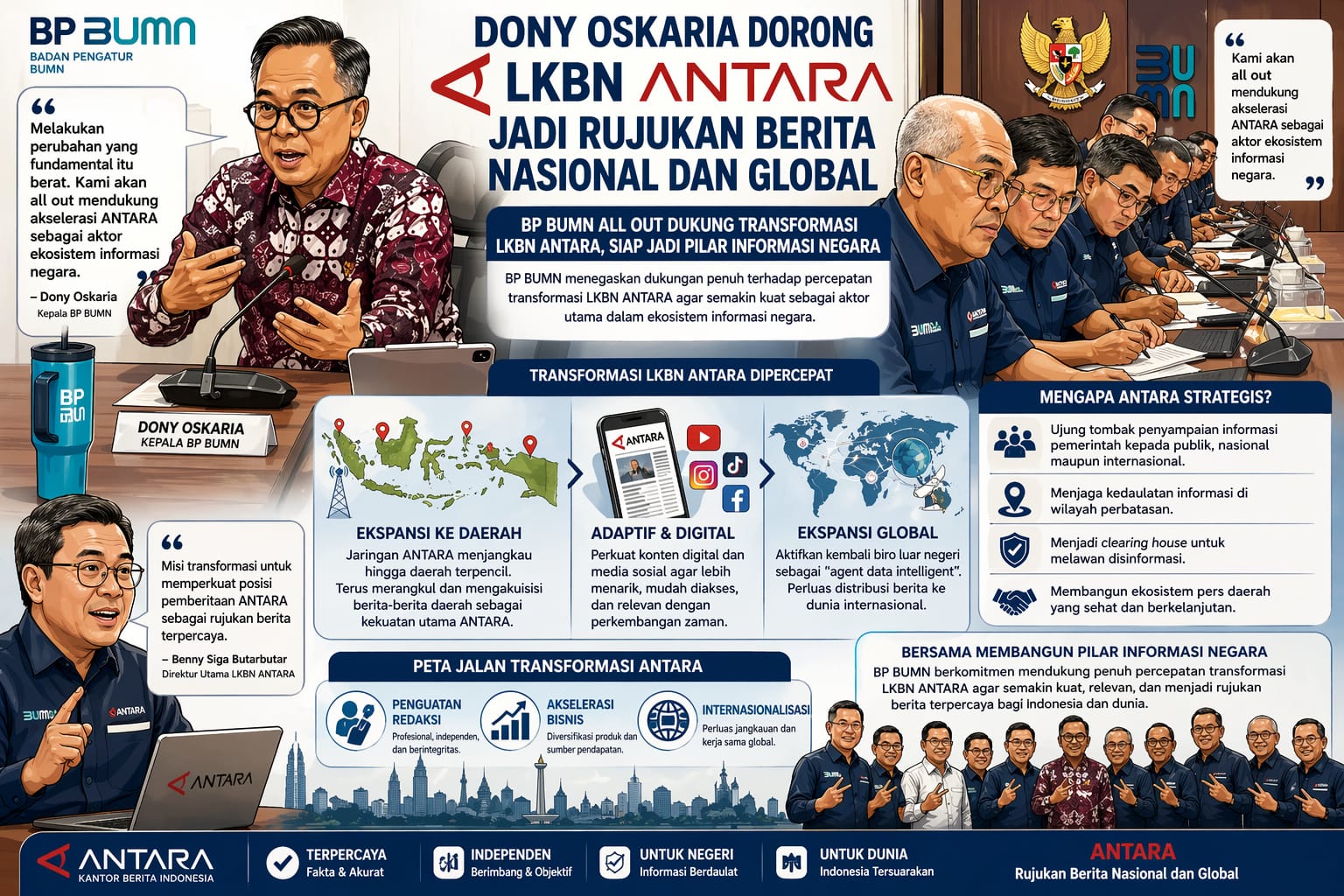 Komitmen tersebut disampaikan Kepala BP BUMN Dony Oskaria saat menerima Ketua Dewan Pengawas ANTARA Akhmad Munir bersama anggota Dewan Pengawas Wicaksono, Ramadhan Pohan, Adrian Tuswandi, Arie Kristian, serta jajaran direksi pada Rabu, (22/2026), di Jakarta.