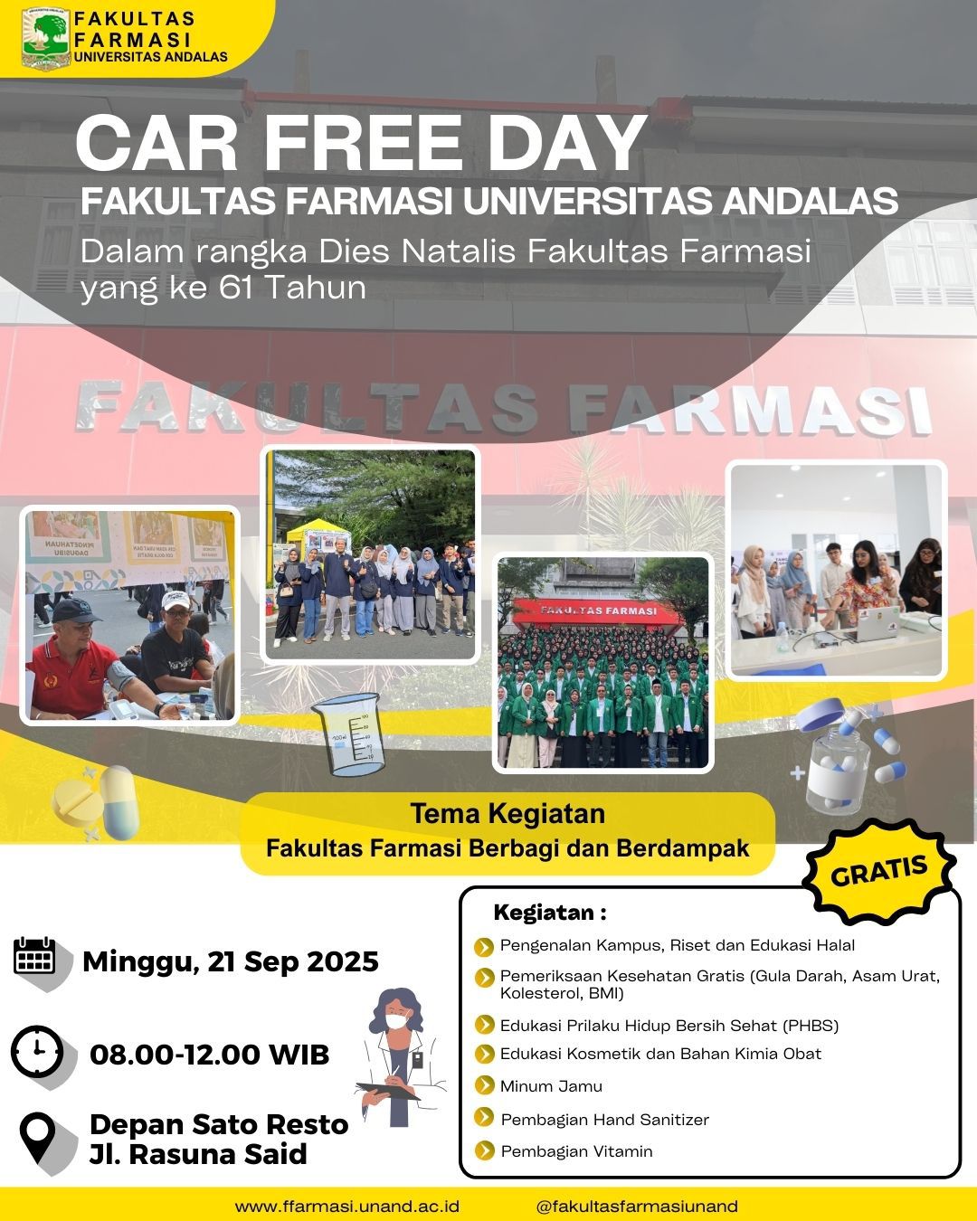 Padang, RANAHNEWS – Fakultas Farmasi Universitas Andalas (Unand) memilih merayakan Dies Natalis ke-61 dengan cara yang lebih dekat dengan masyarakat. Pada Minggu (21/9/2025), mereka hadir di kawasan Car Free Day (CFD) Padang dengan menghadirkan layanan edukasi, promosi kesehatan, hingga pemeriksaan medis gratis.