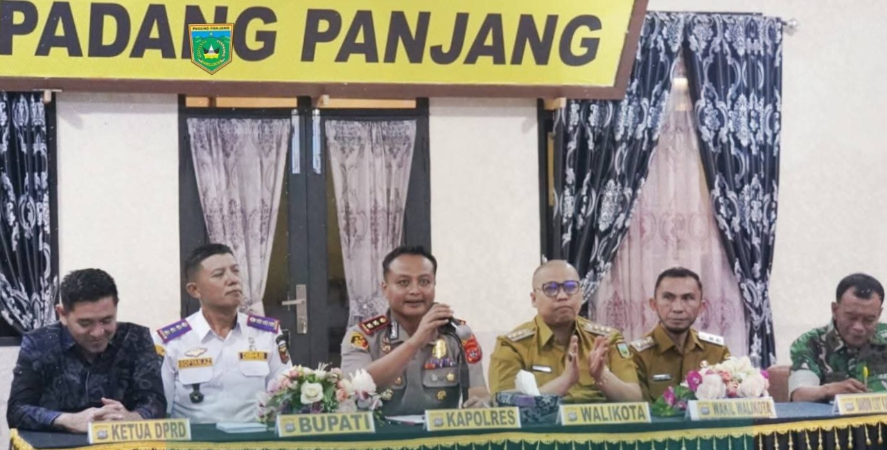 Rapat digelar di Aula Tathya Dharaka Polres Padang Panjang, Senin (9/3/2026). Kegiatan tersebut dihadiri Wali Kota Padang Panjang Hendri Arnis, Wakil Wali Kota Allex Saputra, Ketua DPRD Imbral, Kapolres AKBP Wisnu Hadi, unsur Forkopimda, kepala OPD di lingkungan Pemko Padang Panjang, serta perwakilan instansi terkait dari Kabupaten Tanah Datar.
