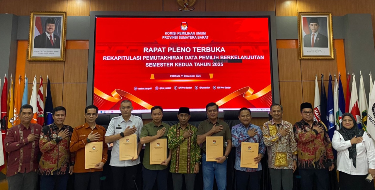Padang, RANAHNEWS — Komisi Pemilihan Umum (KPU) Provinsi Sumatera Barat menggelar rapat pleno terbuka rekapitulasi pemutakhiran data pemilih berkelanjutan semester kedua tahun 2025 di Aula KPU Sumbar, Kamis (11/12/2025). Kegiatan ini digelar untuk memastikan ketepatan, kualitas, dan akurasi data pemilih di seluruh kabupaten dan kota.