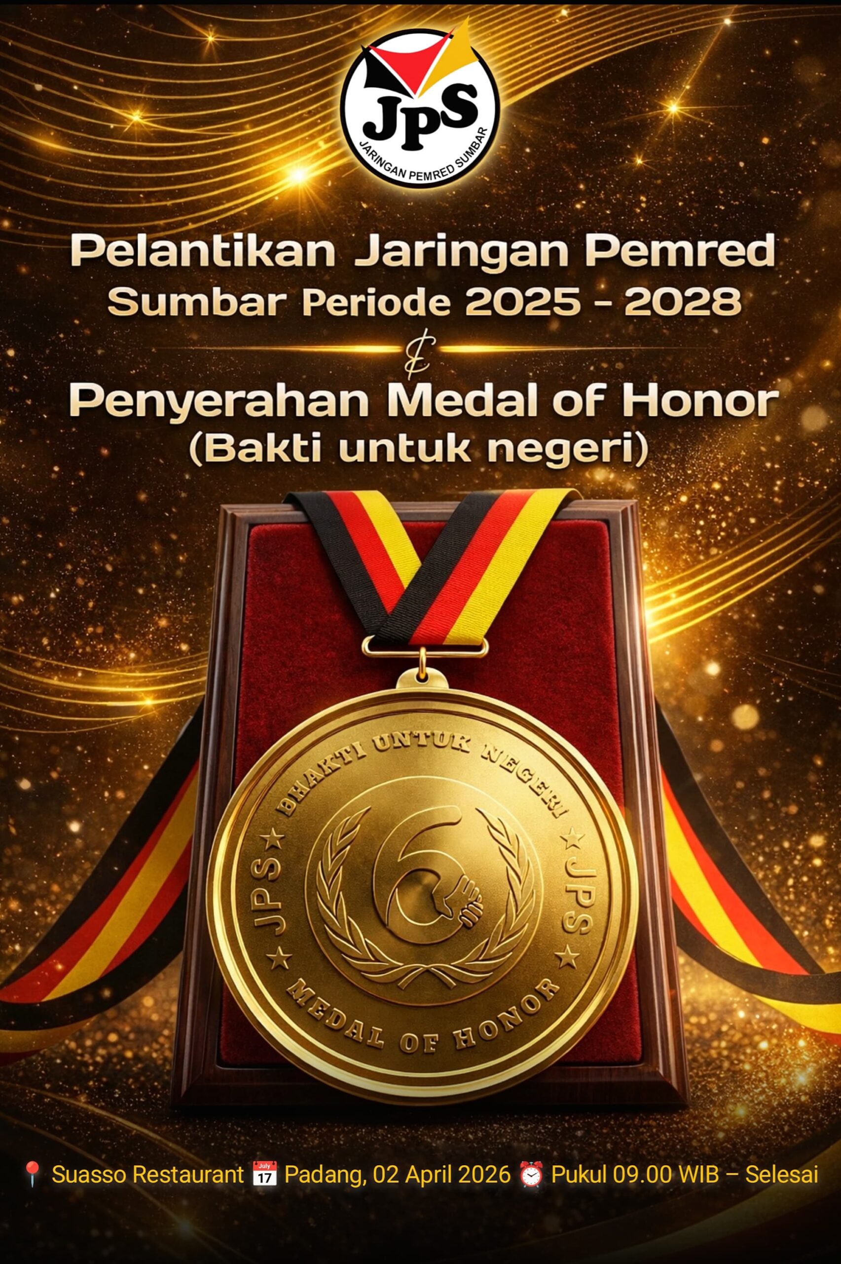 Padang, RANAHNEWS.com — Jaringan Pemred Sumbar (JPS) akan melantik kepengurusan periode 2025–2028 sekaligus menyerahkan penghargaan Medal of Honor kepada tokoh dan lembaga yang dinilai berkontribusi dalam pemulihan Sumatera Barat pascabencana, di Padang, Kamis (2/4/2026).