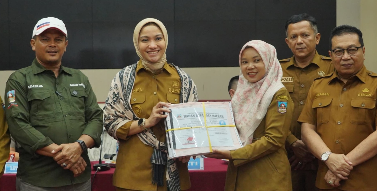 Bupati Dharmasraya Annisa Suci Ramadhani secara simbolis menyerahkan dokumen tersebut kepada Nagari Koto Nan IV Dibawuah, Kecamatan Sembilan Koto, yang sebelumnya mencatat pelunasan Pajak Bumi dan Bangunan (PBB) hingga 100 persen.