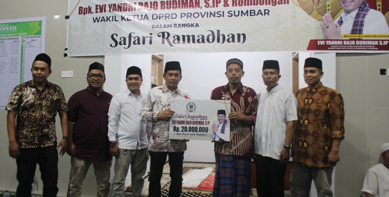 Padang, RANAHNEWS.com — Wakil Ketua DPRD Sumatera Barat, Evi Yandri Rajo Budiman, menyalurkan bantuan Rp20 juta kepada Mushalla Al-Jannah saat Safari Ramadhan 1447 Hijriah di Kelurahan Limau Manis Selatan, Kecamatan Pauh, Kota Padang, Sabtu malam (21/2/2026).