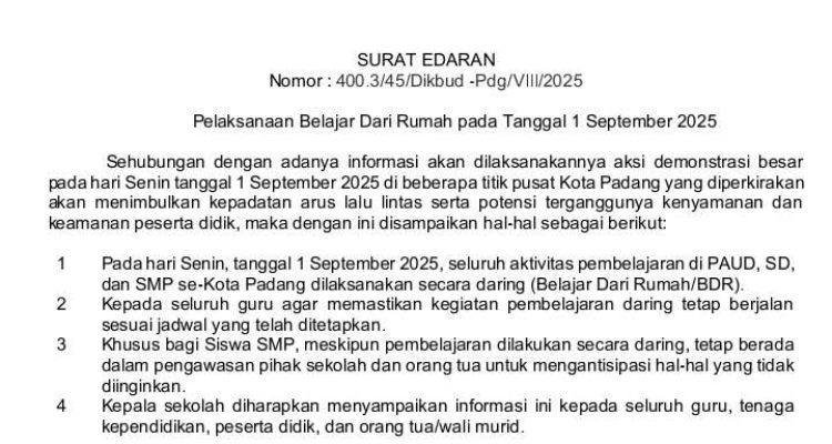Antisipasi Demo, Siswa PAUD hingga SMP di Padang Belajar dari Rumah 1 SeptemberPendidikan|31 Agustus 2025oleh PRN